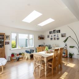 The spacious and practical kitchen and dining area, enhanced by skylights, enjoys plenty of natural light and flows seamlessly into the living room, creating a welcoming environment for everyday life. From here, step into the sun-soaked sunroom-an inviting space that connects directly to two of the bedrooms along the front of the house, enhancing the home's versatility and sense of connection.