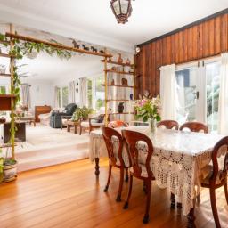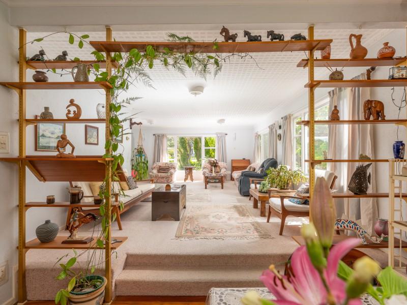 There's open flow between the kitchen, dining and the generous living room, which has big windows and a lovely elevated leafy outlook across to the hills.
