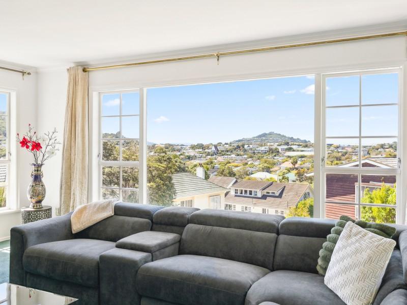 Light-filled separate living and dining areas with sweeping views from Mount Kaukau to Tinakori Hill.