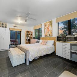 The sleepout includes a bedroom and a kitchenette with sink and cabinetry, along with its own private deck-ideal for extended family, guests, or a border providing an additional income stream.