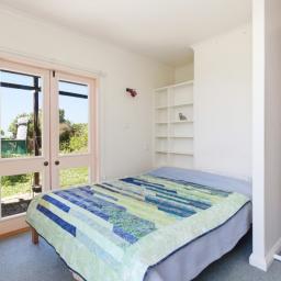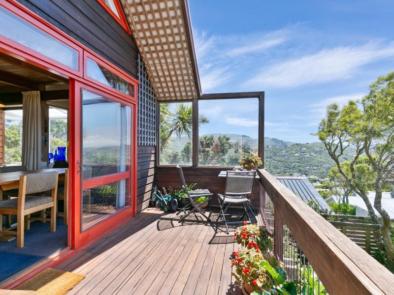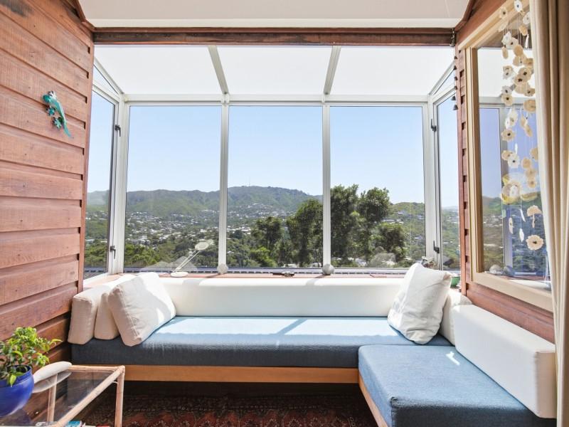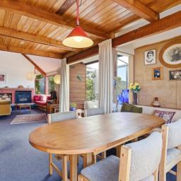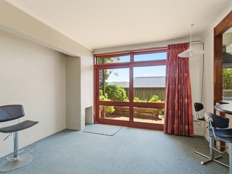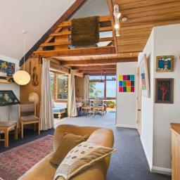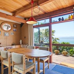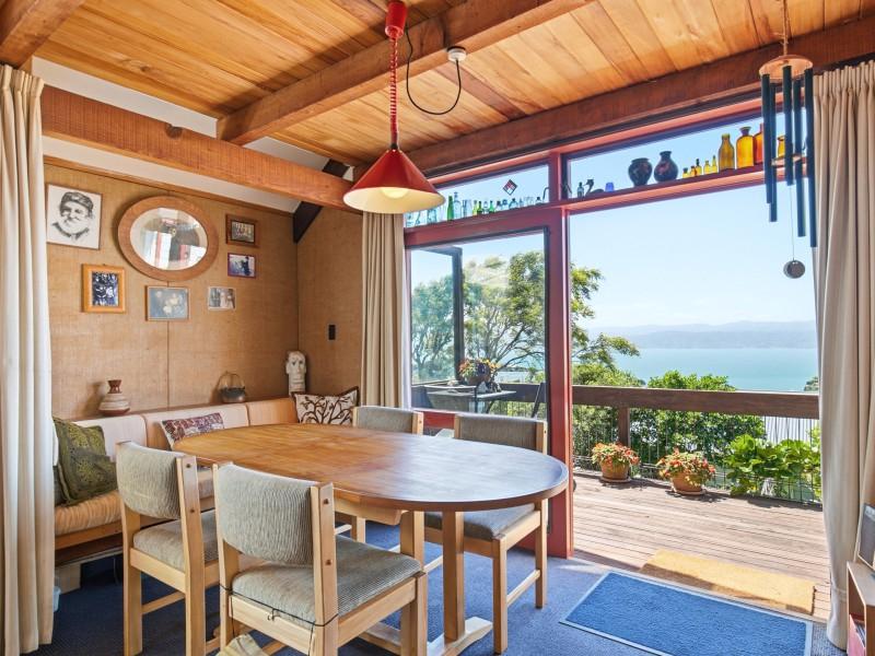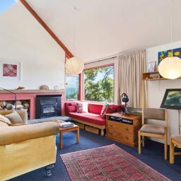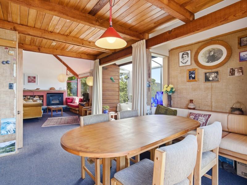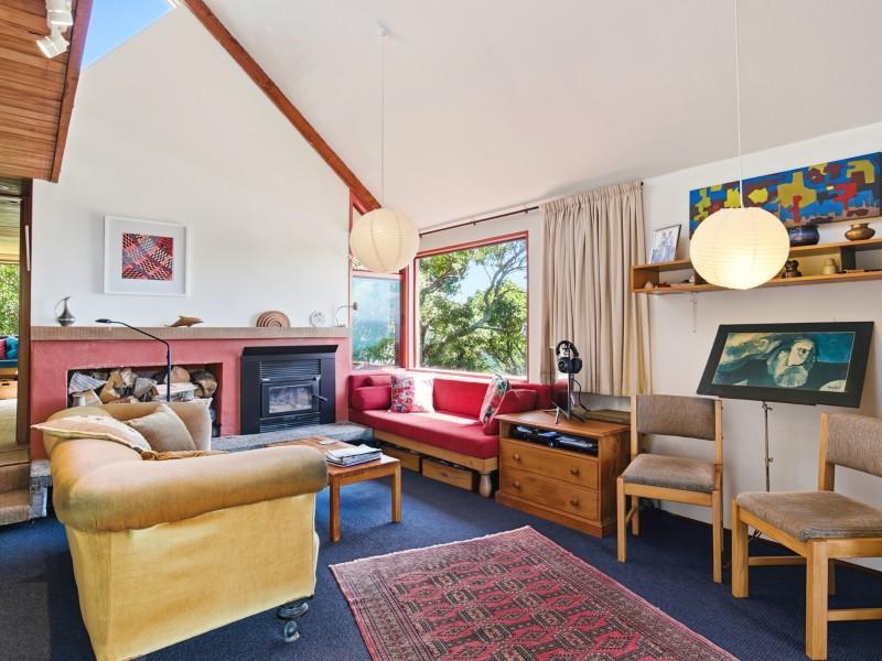 - Separate living and dining, complete with integrated woodburner, sunny alcove for curling up in the all-day sun, and northeast-facing deck that’s sheltered from the southerly and glazed to mitigate the northerly