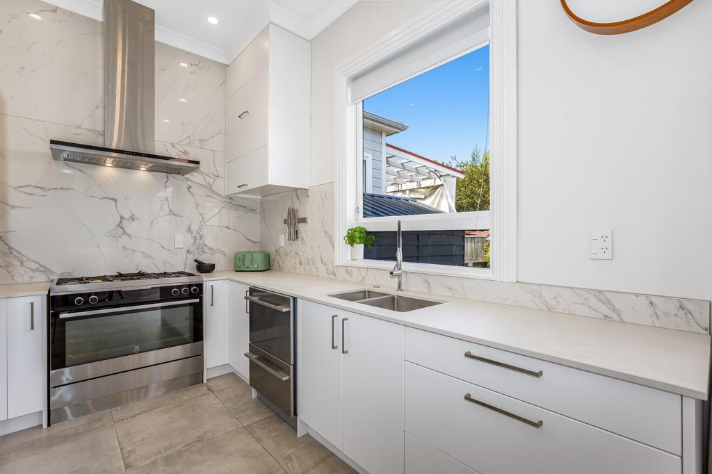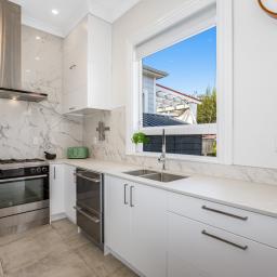 • A sleek, stylish, modern kitchen with plenty of cupboard space, bench space and 900mm quality stove