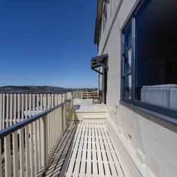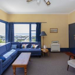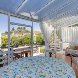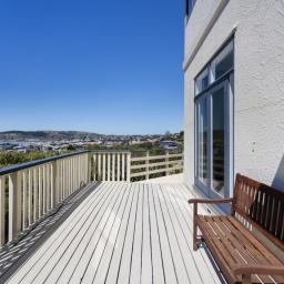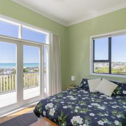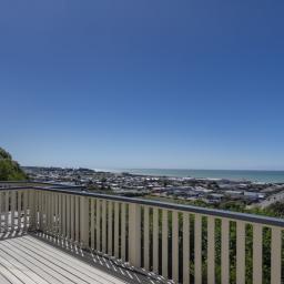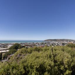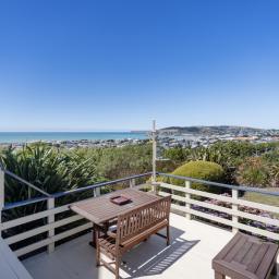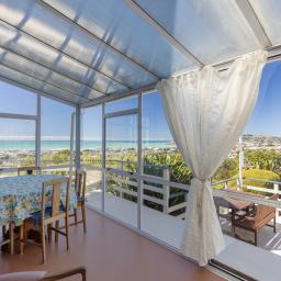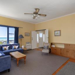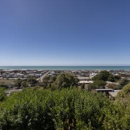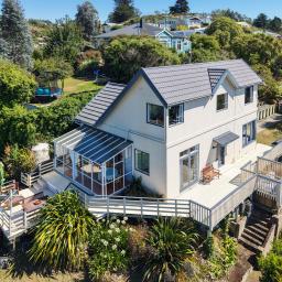 Set in an elevated position and bathed in natural light, this charming two-storey home enjoys panoramic views across the township and out to the sea.