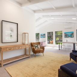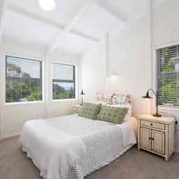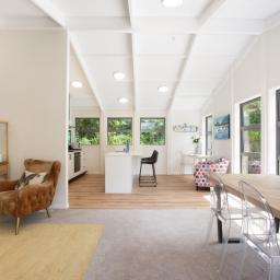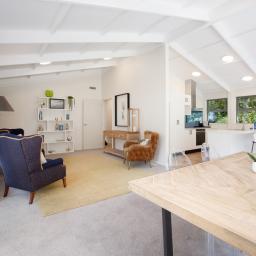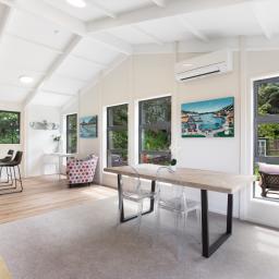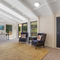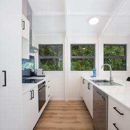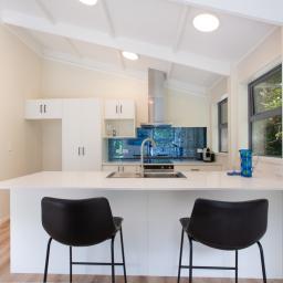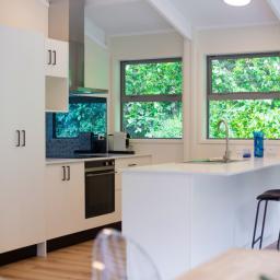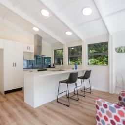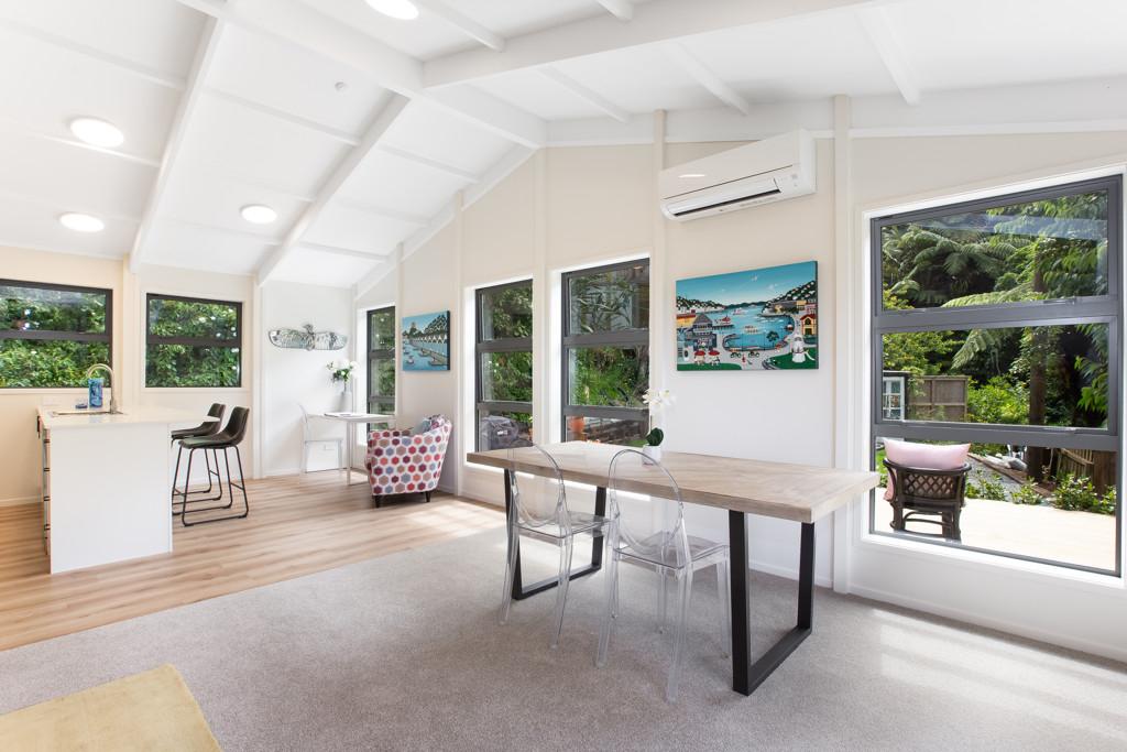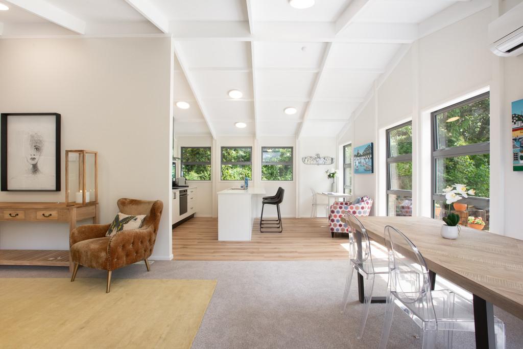 • Light-filled attractive kitchen/living with a high stud vaulted ceiling, stone bench tops and induction cooktop