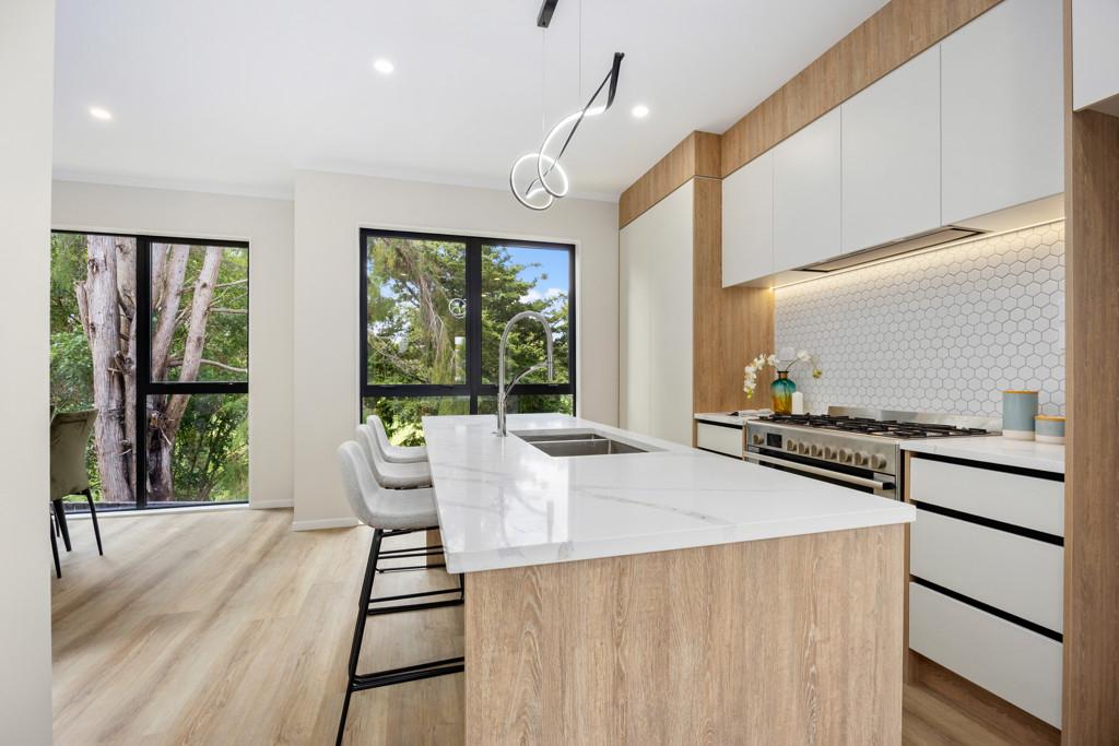 Downstairs, the open-plan kitchen and dining enjoy stunning, uninterrupted views across the Remuera Golf Course, flowing seamlessly into the lounge and out to a wrap-around deck - the perfect place to relax or entertain while taking in the tranquil green surrounds. A well-appointed powder room completes the lower-level living.