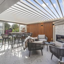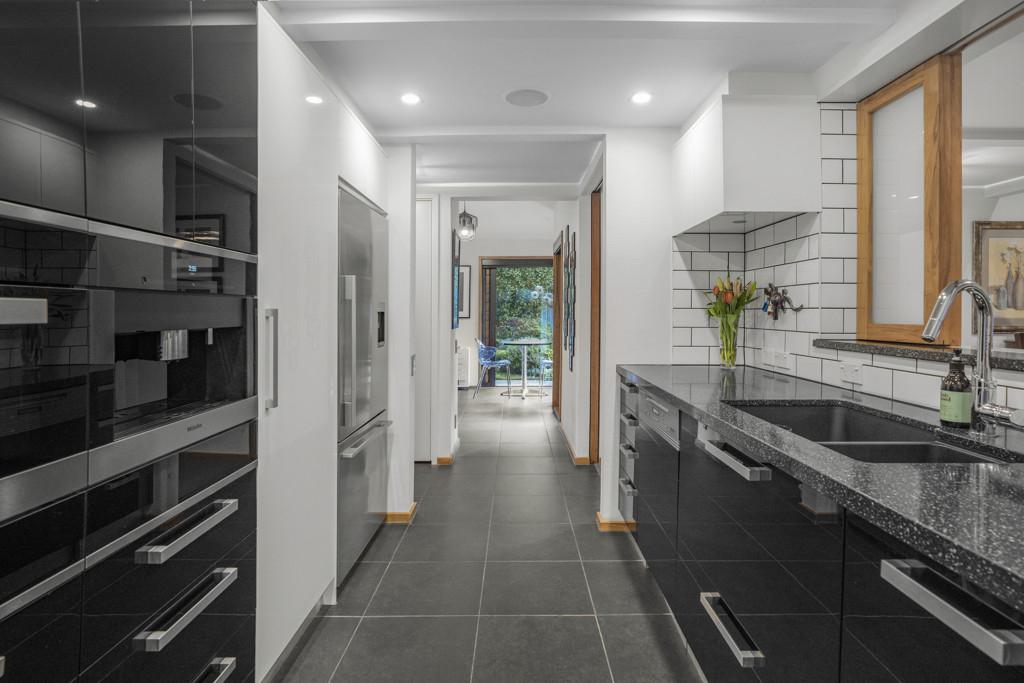 The main living room is warmed by a gas heater, while the dining area opens to a west-facing backyard, an inviting setting for afternoon sun and outdoor entertaining. The kitchen is a true masterpiece, featuring premium Miele appliances including a steam combination oven, plumbed-in coffee machine, induction cooktop, warming drawers and a hush range hood. A second living area offers a sun-filled retreat, media room or quiet space to unwind.