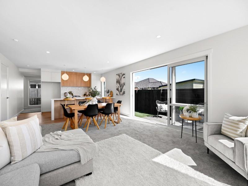 The open-plan living, dining, and kitchen area is bright and welcoming, centred around a sleek modern kitchen with peninsula seating. Sliding doors provide seamless indoor-outdoor flow to a sunny patio — perfect for entertaining or relaxed family living.
