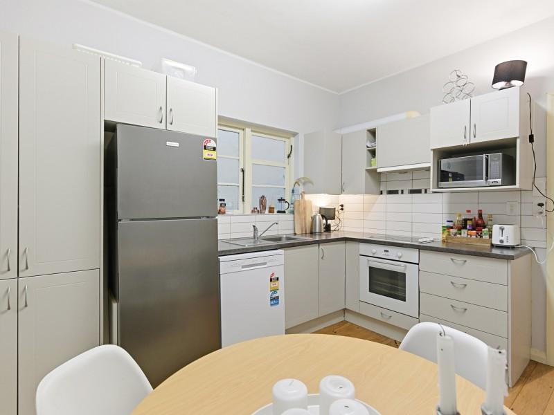- Ergonomic eat-in kitchen with near-new appliances, plus a bathroom/laundry with checkerboard flooring