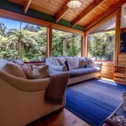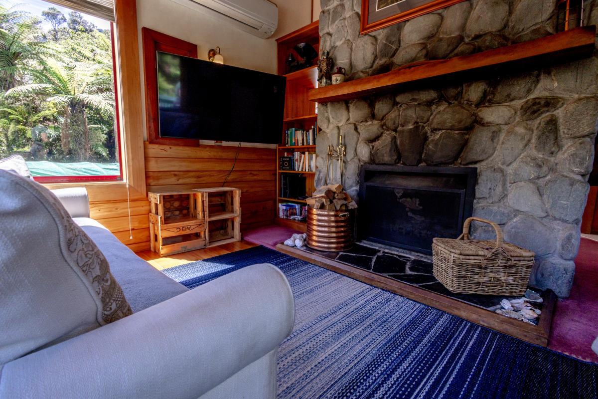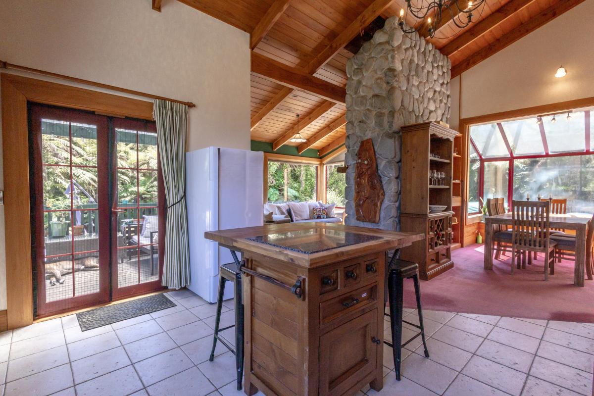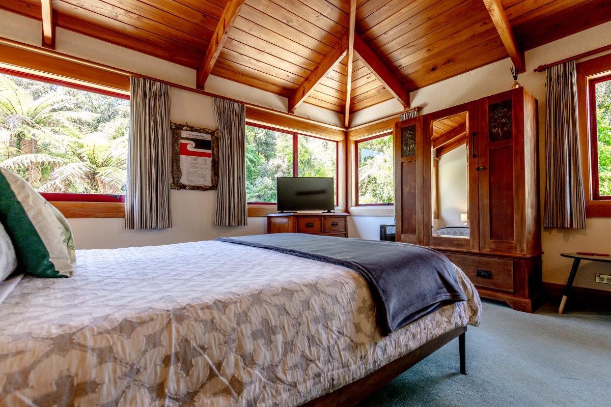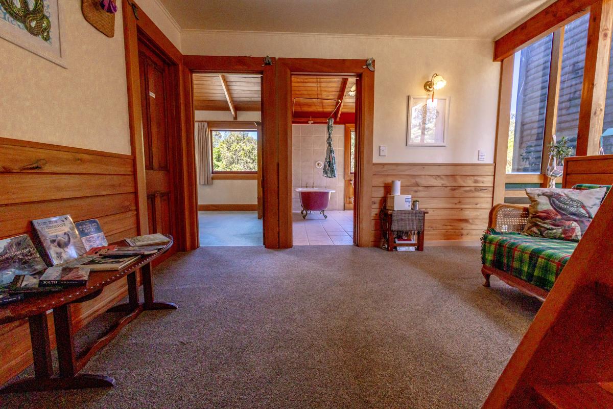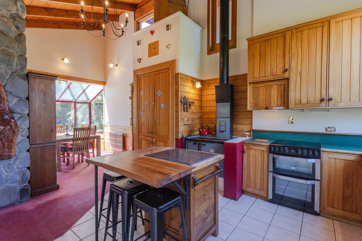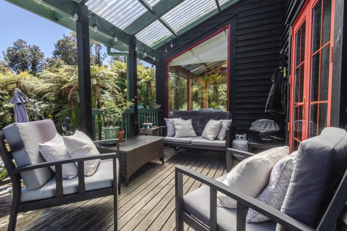 Oversized windows frame the surrounding greenery, a window seat invites quiet moments, and a separate living room with open fire creates a cosy haven on cooler West Coast evenings. Comfort is assured year-round with a coal range heating radiators and hot water, complemented by two heat pumps.