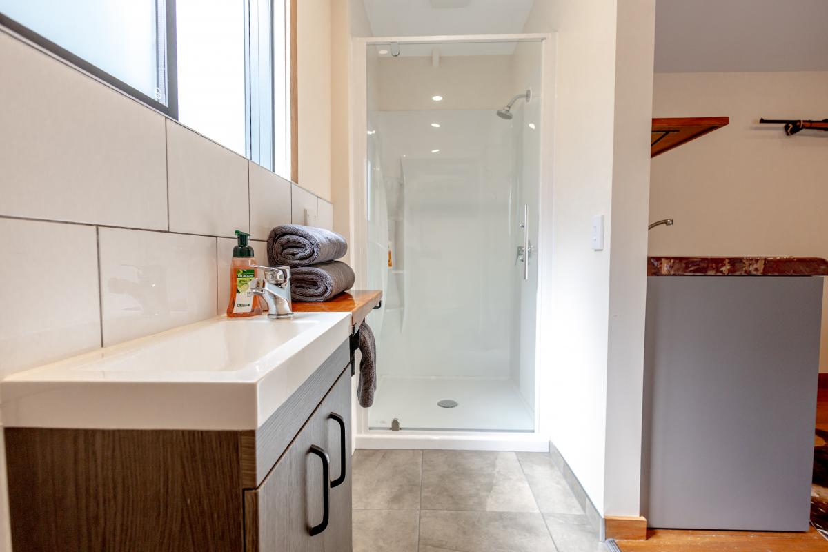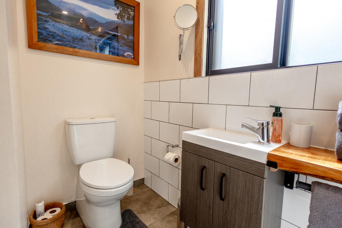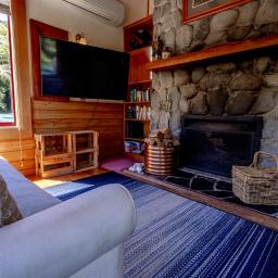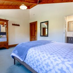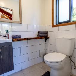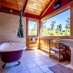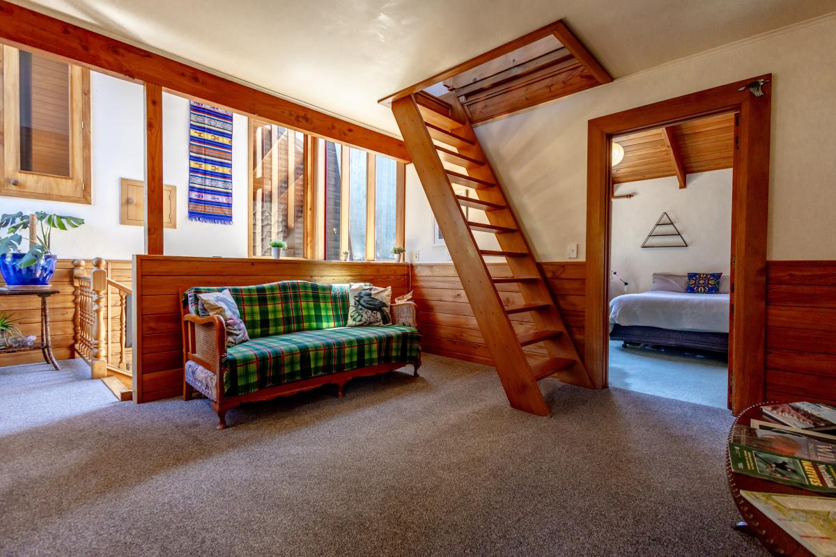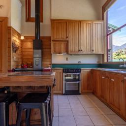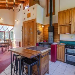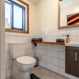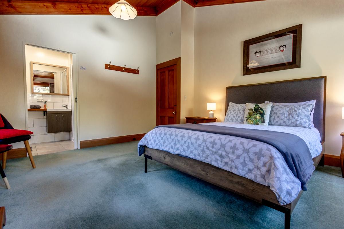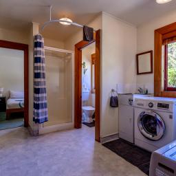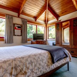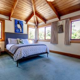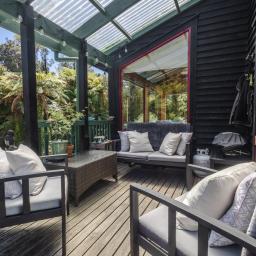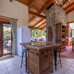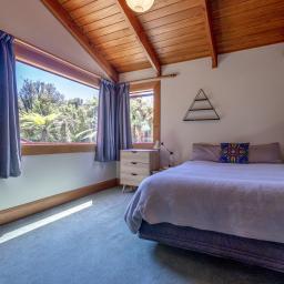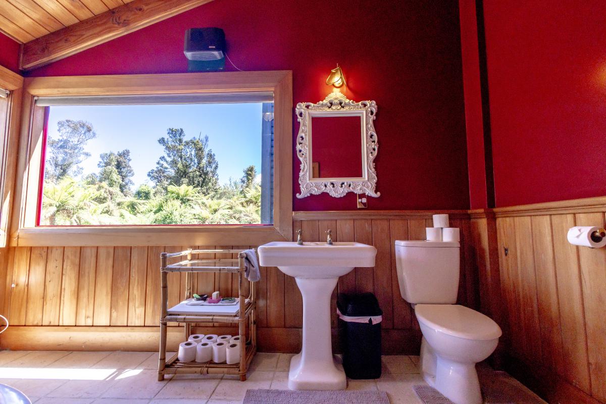 Oversized windows frame the surrounding greenery, a window seat invites quiet moments, and a separate living room with open fire creates a cosy haven on cooler West Coast evenings. Comfort is assured year-round with a coal range heating radiators and hot water, complemented by two heat pumps.