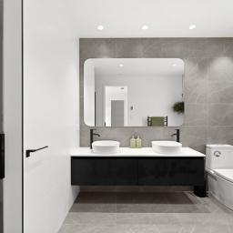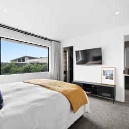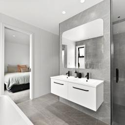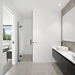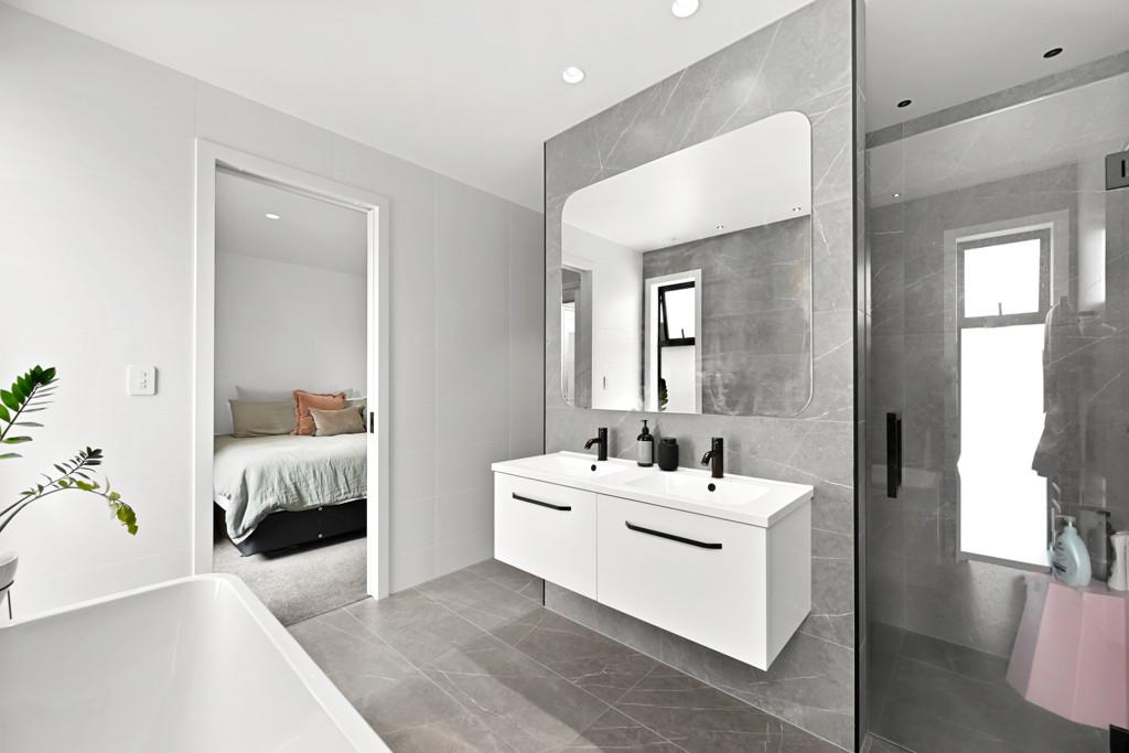 The master suite is a private sanctuary, complete with a beautifully appointed ensuite featuring twin basins and a walk-in wardrobe. Two additional bedrooms are serviced by a sleek central bathroom in a well-considered Jack-and-Jill configuration, providing both convenience and style.