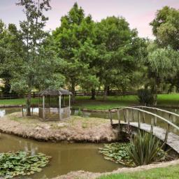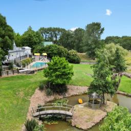 The grounds are anchored by a miniature lagoon, complete with a charming bridge leading to a central island, creating a peaceful, storybook setting that feels worlds away from the everyday.