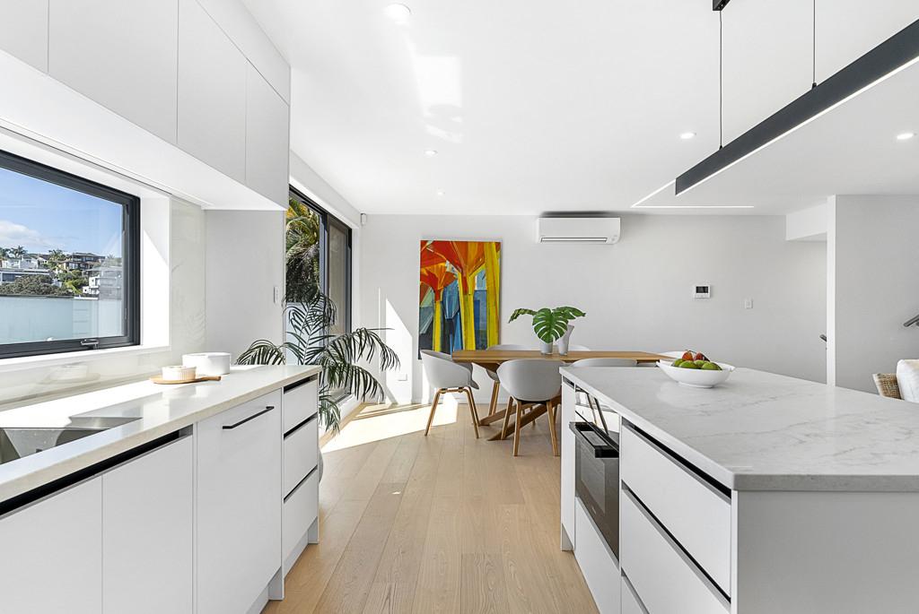 Upstairs: The open-plan kitchen and living area is filled with natural light. The designer kitchen features Miele appliances, including a steam oven, and flows seamlessly onto a sunny balcony - ideal for morning coffee or evening drinks.