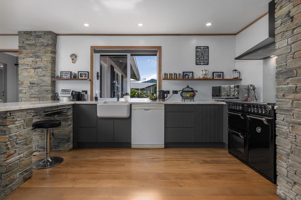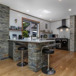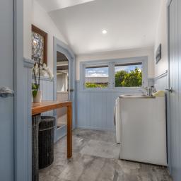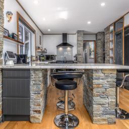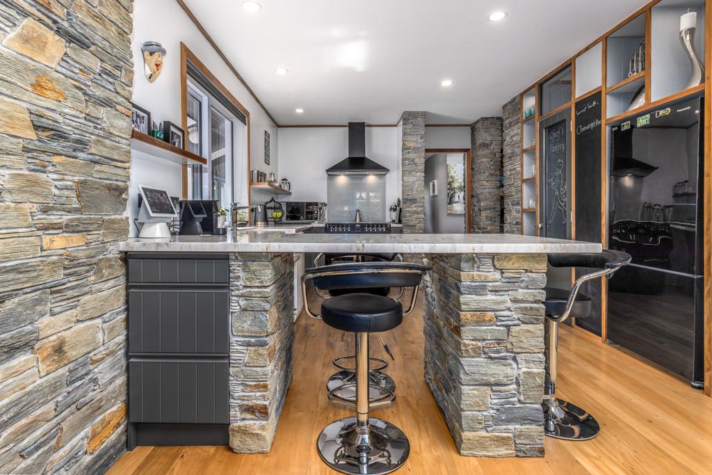 The inviting living area features recycled Rimu flooring, schist stone accents, and a modern, thoughtfully designed kitchen. Skylights bring natural light streaming in, creating a bright, uplifting atmosphere throughout the day. Two bathrooms and a separate laundry add everyday convenience.