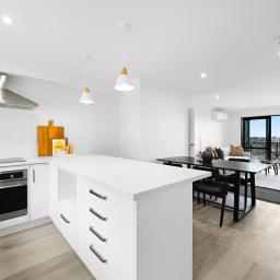 The apartment is thoughtfully designed with an open-plan kitchen and living area that flows seamlessly to the balcony, creating a functional and comfortable living space. With a generous 77m² floor area, it offers excellent proportions for apartment living.