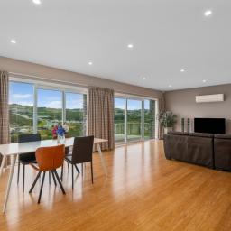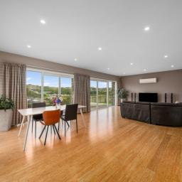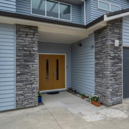 Double glazing and heat pumps , and low maintenance Lineaboard and feature schist look panels for the exterior cladding.