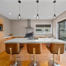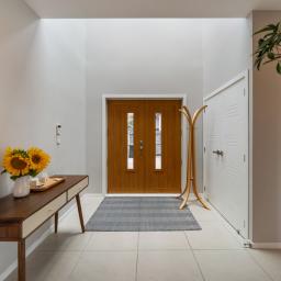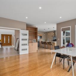 A grand entrance with double doors and a tiled foyer to greet you and then into the superb open plan kitchen/dining/living room with wooden floors and lovely natural light, with high ceilings and sliding doors to the huge deck and patio.