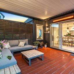 At the heart of the home, interior spaces extend seamlessly to a timber-decked loggia. Designed for year-round enjoyment, this sheltered outdoor room features cafe curtains, an automated louvre roof and outdoor heating - creating the perfect setting for relaxed evenings and effortless entertaining, whatever the weather.