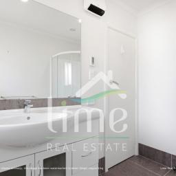 GROOM: The main bathroom is modern and luxurious, with a shower, vanity and mirror unit, towel rail and tiled floors.