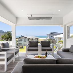 All-Season Entertaining: The generous, partially covered upper deck is designed for year-round enjoyment, complete with built-in heaters-ideal for hosting guests while watching the waves roll in.