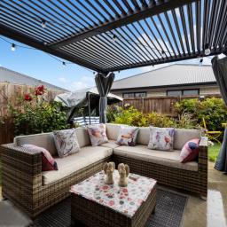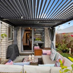 The open plan living zone forms the heart of the home, flowing out to a louvered pergola that creates an all-weather outdoor living space, perfect for year-round entertaining, relaxed evenings, or simply enjoying a sheltered spot in the sun.