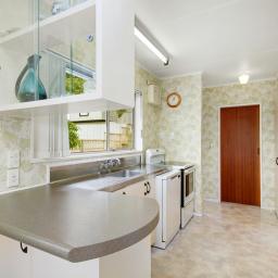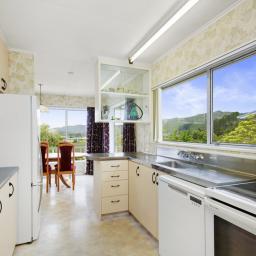 With a designated laundry to the side, the kitchen is a well proportioned and functional space, with generous cabinetry, a pantry, open shelving and a mix of benchtop surfaces including stainless steel.