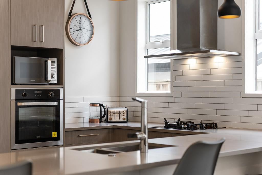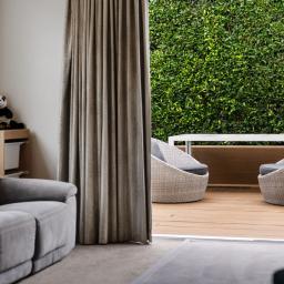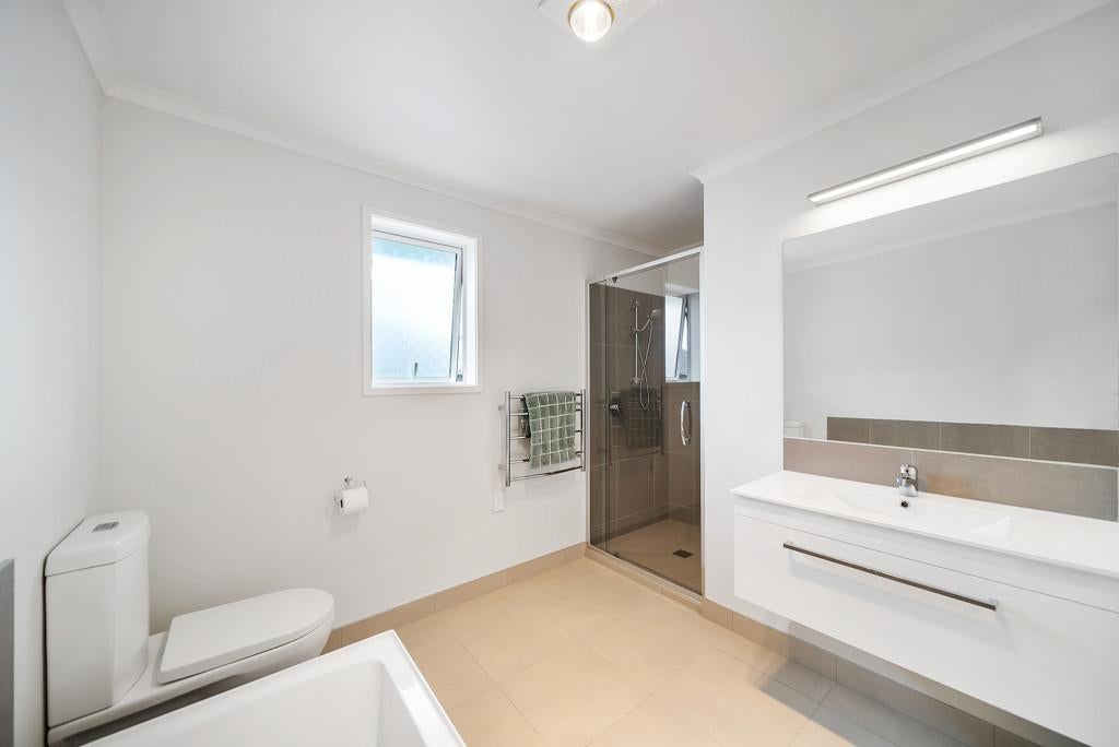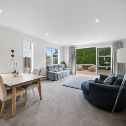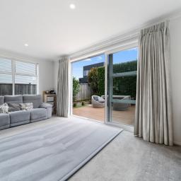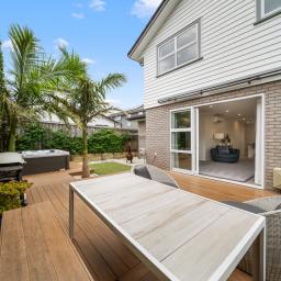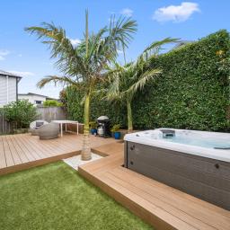 The heart of the home is the large, modern kitchen with high-end finishes, flowing seamlessly into the open-plan living and dining area. This space opens out to what is undoubtedly the standout feature of the property: a beautifully landscaped outdoor deck designed for year-round use. With a spa recessed into the decking, a generous retractable sunshade and excellent privacy, it's a space that works just as well for entertaining as it does for switching off at the end of the day.