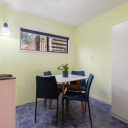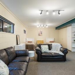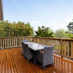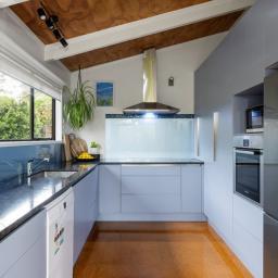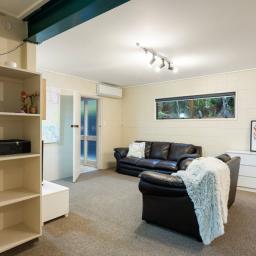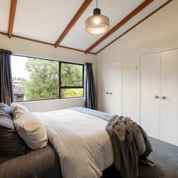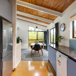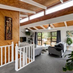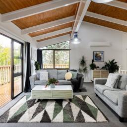 Capturing natural light, the bright and spacious interiors are enhanced by raked ceilings. The large kitchen, dining, and lounge seamlessly connect and extend outdoors to a wraparound deck, perfect for alfresco dining, morning coffees, or simply enjoying the leafy views. A cozy fireplace and a heat pump ensure the lounge is always warm and welcoming.