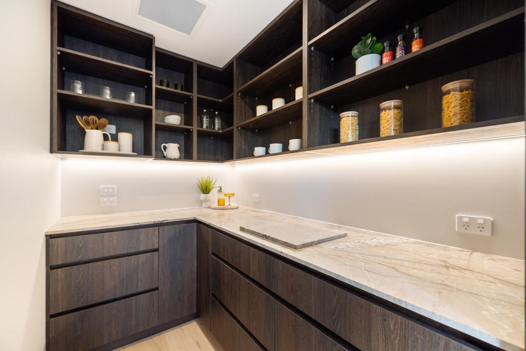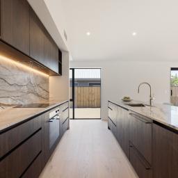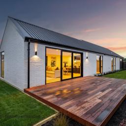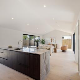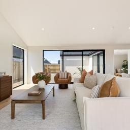 Step inside to an expansive open-plan kitchen, dining and living area, where vaulted scissor-truss ceilings and engineered timber floors enhance the sense of space and light to create a seamless flow for modern living. The heart of the home is the beautifully appointed kitchen, featuring engineered stone with a waterfall edge benchtop, quality Fisher & Paykel appliances, a plumbed fridge space and a walk-in pantry, making it perfectly suited to both everyday family life and entertaining. A large separate lounge provides a second living area, ideal for relaxing or hosting guests. All living spaces seamlessly flow to the outdoors, opening effortlessly to the sun-soaked outdoor patio and deck area ideal for entertaining.