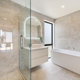 The home features four well-proportioned bedrooms, each with excellent built-in storage. The master suite is a true private retreat, highlighted by vaulted scissor-truss ceilings, a generous walk-in wardrobe, and a beautifully tiled ensuite complete with under-tile heating, double sink and a spacious double shower. The family bathroom mirrors this high level of finish, offering a fully tiled shower, under-tile heating, and is complemented by a separate toilet.