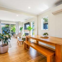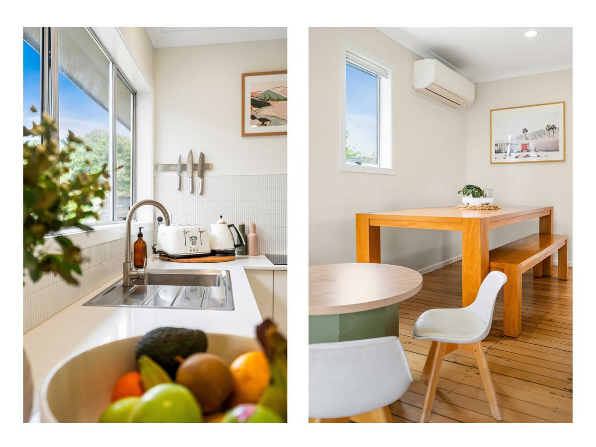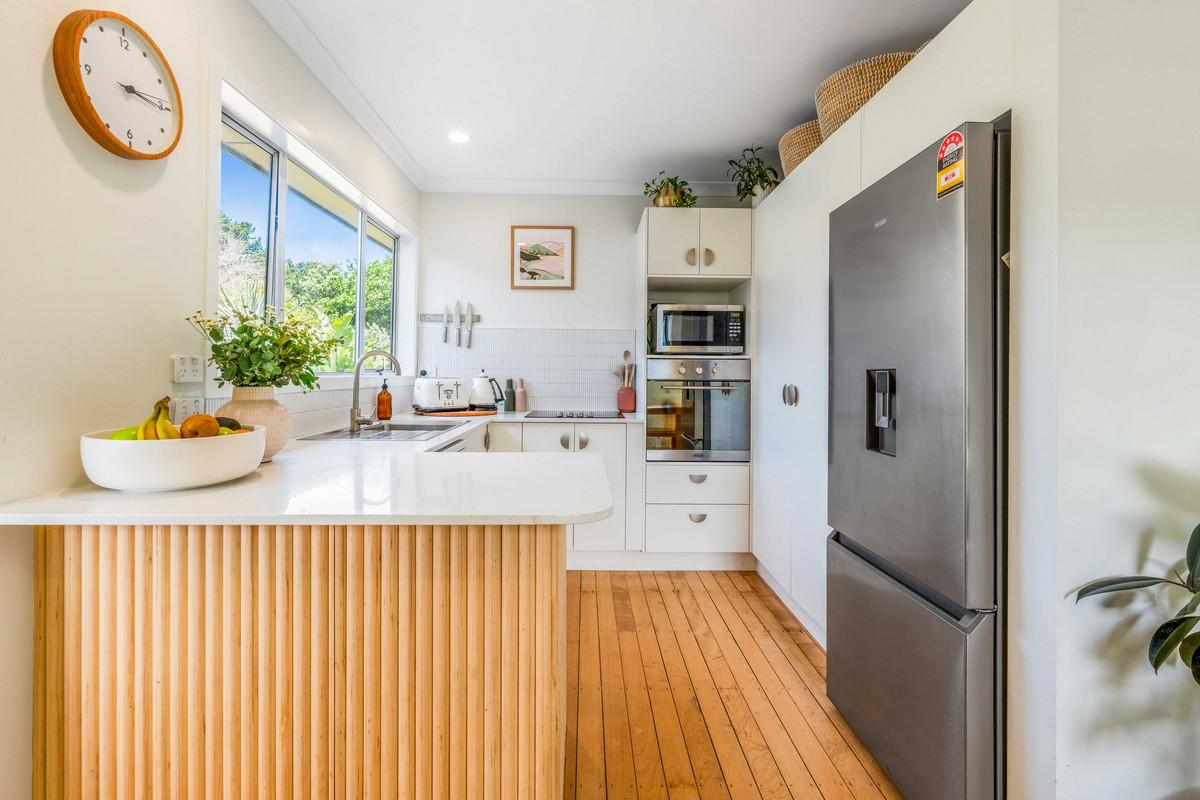 - Bright, sunny open-plan living, timber floors, a woodburner, and a heat pump for year-round comfort.
