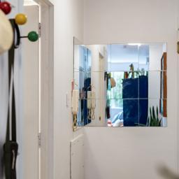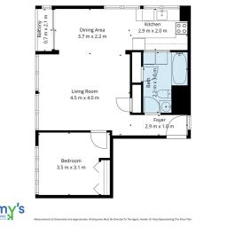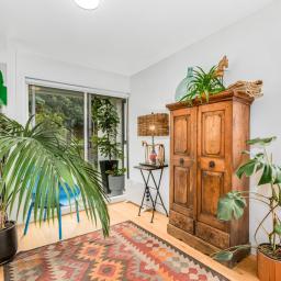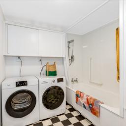 A refreshed functional bathroom with a new vanity and wc and stylish chequered flooring. The laundry is integrated into the bathroom space and there's plenty of storage throughout. The spacious double bedroom has a generous sized closet with smart built in storage.