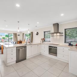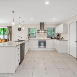 Step into the heart of the home – a spacious, well-appointed kitchen featuring a peninsula bench with breakfast bar, luxurious tri-stone benchtops, and a walk-in pantry. The open-plan layout seamlessly connects to the dining and living areas, opening onto a covered outdoor entertaining space complete with an Archgola and outdoor heater.