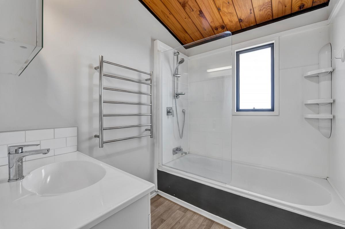 Upstairs, the heart of the home opens wide. The open plan kitchen, living and dining area is joined by a second living room, both flowing seamlessly to a large deck that wraps around two sides of the home. The U-shaped kitchen offers generous bench space, keeping the cook part of everyday life while easily handling busy mornings. A skylight above adds soft natural light, complementing the light-painted walls and striking dark timber ceilings. Three further bedrooms sit on this level, including the primary suite with walk-in wardrobe and ensuite.
