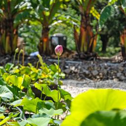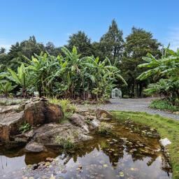 Set across approximately 4.8 hectares, the land itself is a sanctuary. Over many years it has been transformed into a lush, immersive tropical environment - water gardens, lotus ponds, a banana park, wetlands alive with birdlife, an aviary, and a fruit forest woven throughout the landscape. Wherever you walk, nature surrounds you, creating a sense of calm and seclusion that feels removed from the everyday, yet remains conveniently close to amenities.
