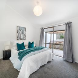 The generous master suite has a sunny outlook to the deck and also boasts an en-suite and walk-in wardrobe.