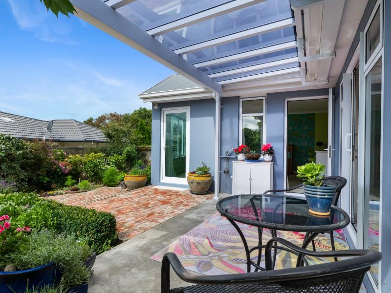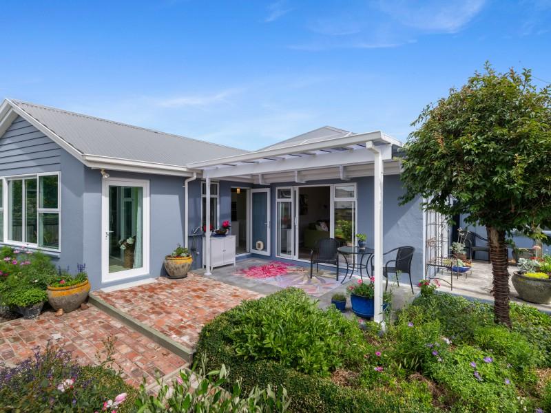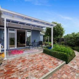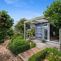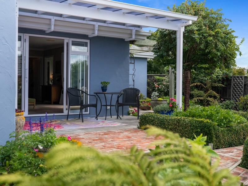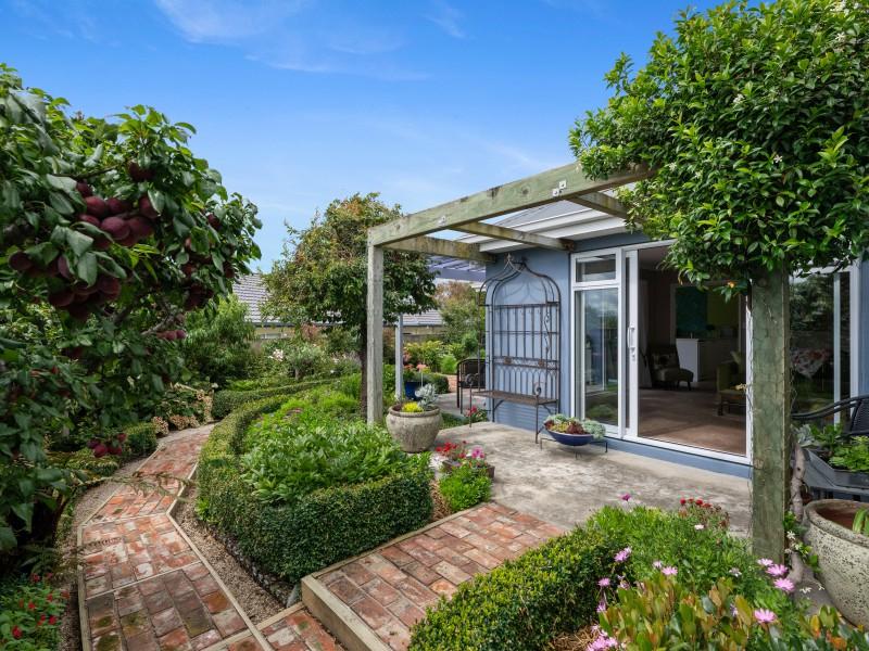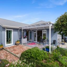 The plaster-over-brick home sits on a compact freehold section that has been cleverly used. There are no lawns demanding weekend attention, yet the garden is anything but bare. Fruit trees and established plantings have been deliberately chosen and carefully grown, creating a layered, mature garden that feels settled and alive. Brick pathways guide you through it all, making it practical to care for and a pleasure to wander through.