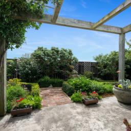 The lounge opens out under an archgola to an outdoor living area, then down wide steps into the garden. It’s a natural extension of the living space and works just as well for quiet mornings as it does for having people over.