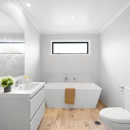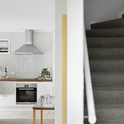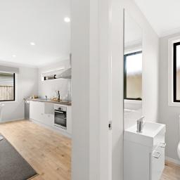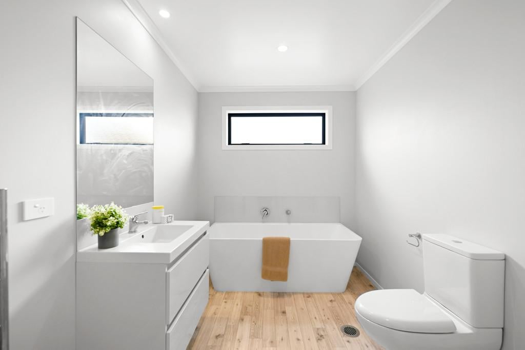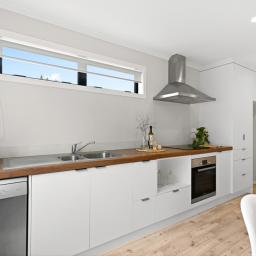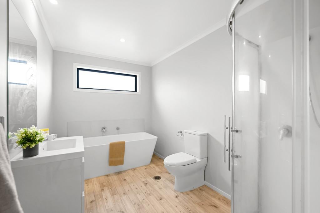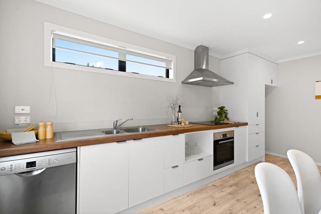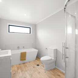 Thoughtful design touches elevate the home, from the statement timber benchtop to the indulgent bathtub, all set against a palette of soft, contemporary neutrals that create a relaxed and refined atmosphere.