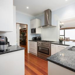 - Open-plan kitchen/dining with stone benchtop & walk-in pantry