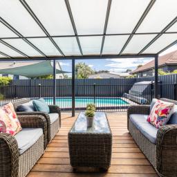 Privacy is paramount, set back from the road on a spacious 850sqm (more or less) freehold site, showcasing expansive open-plan living that seamlessly transitions to the rear garden, which boasts an impressive entertaining area, with in-ground swimming pool, spa pool, and shed.