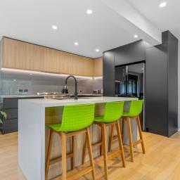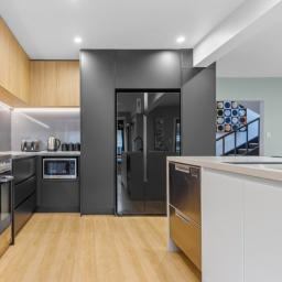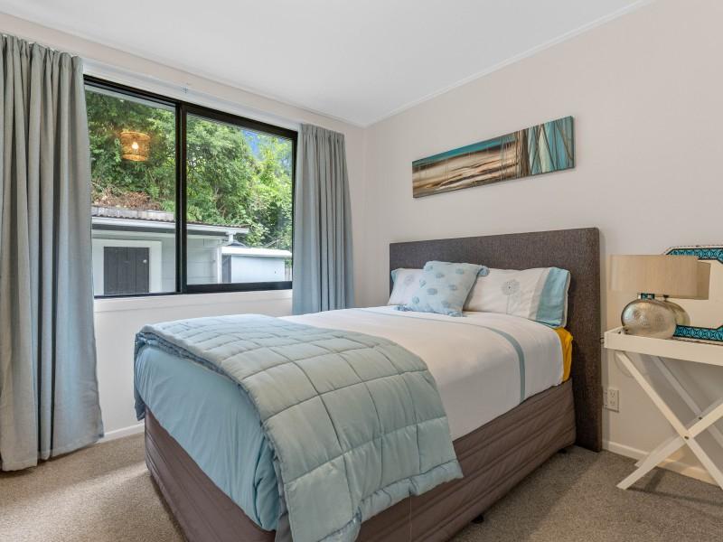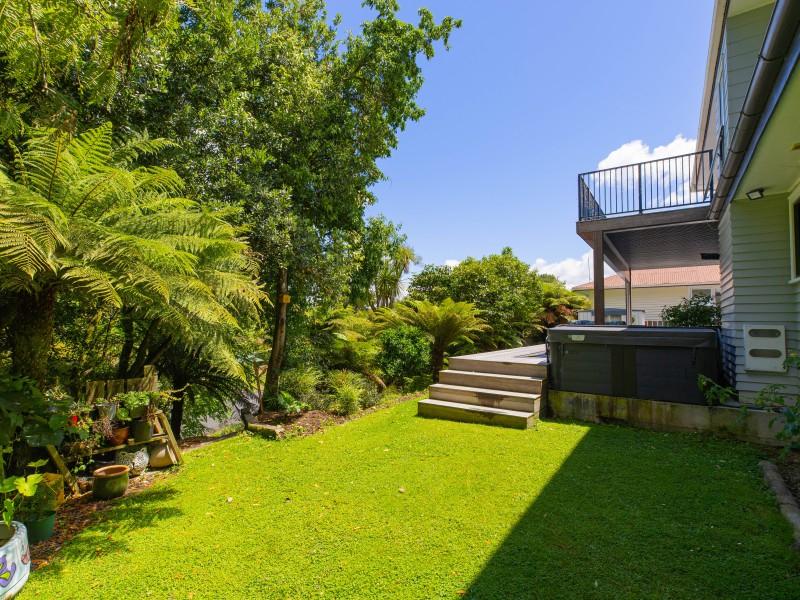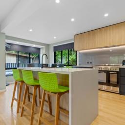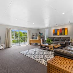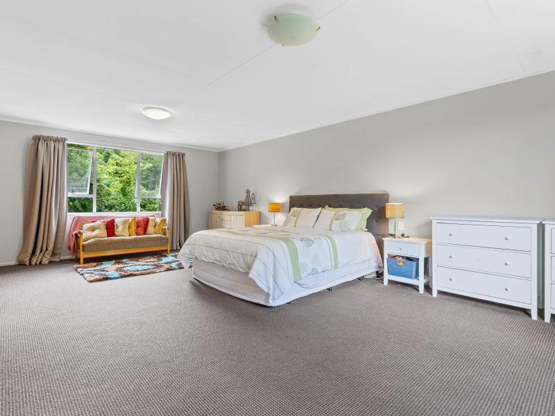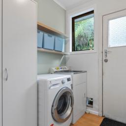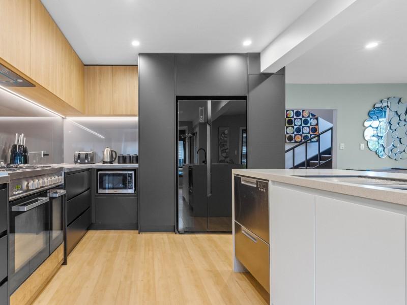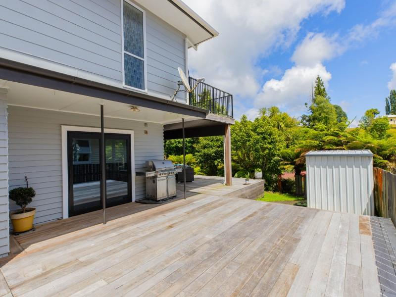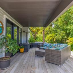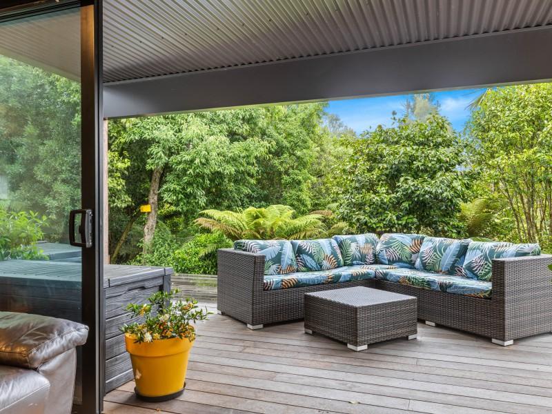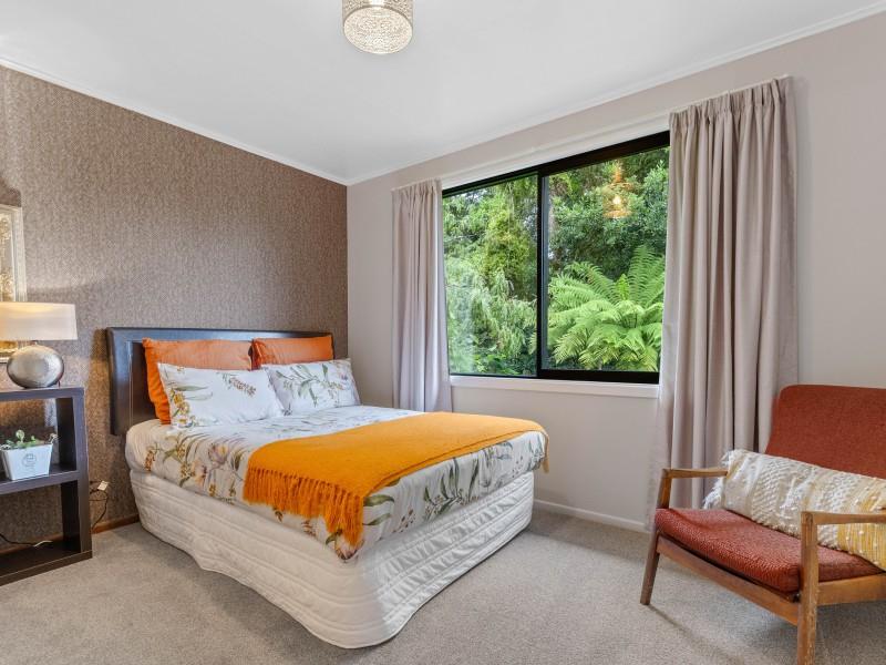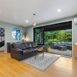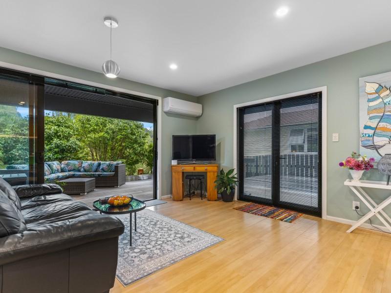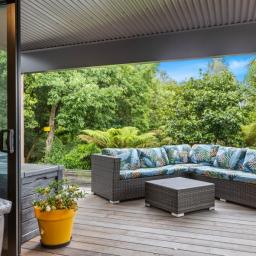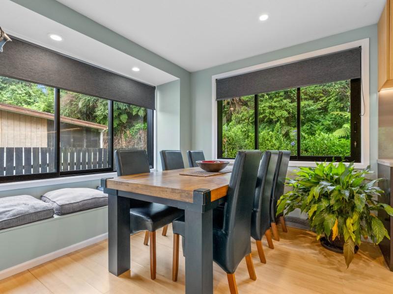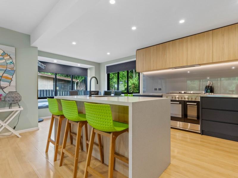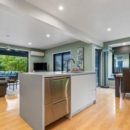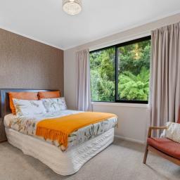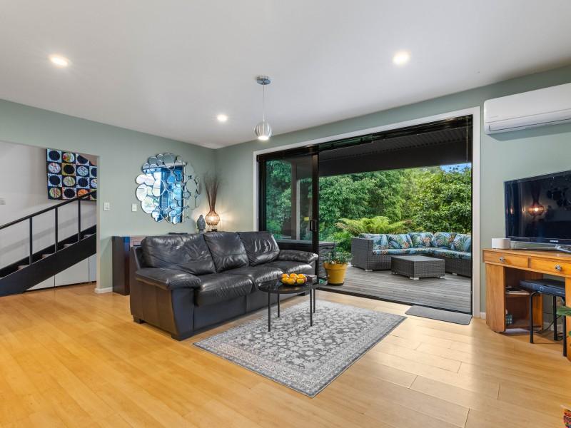 At the heart of the home is the stunning, tastefully renovated kitchen , a true centrepiece that blends style and functionality. The open plan layout creates seamless indoor outdoor flow, leading effortlessly to the exterior decking and overlooks the terraced section. Here, you will feel immersed in nature while still enjoying the convenience of being close to town. The downstairs joinery has recently been upgraded with double glazing, the joinery looks very sleek and complements the flair and style the home offers.
