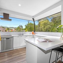 The modern kitchen and dining area capture picturesque views, while elegant French doors open through to the lounge, providing flexibility for open plan living or a cosy, separate retreat. Warm and inviting, the lounge features a wood burner - ideal for the winter months - and flows seamlessly to the meticulously landscaped outdoor area. This lush green oasis offers the perfect setting for relaxed living or generous entertaining.