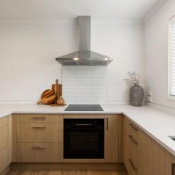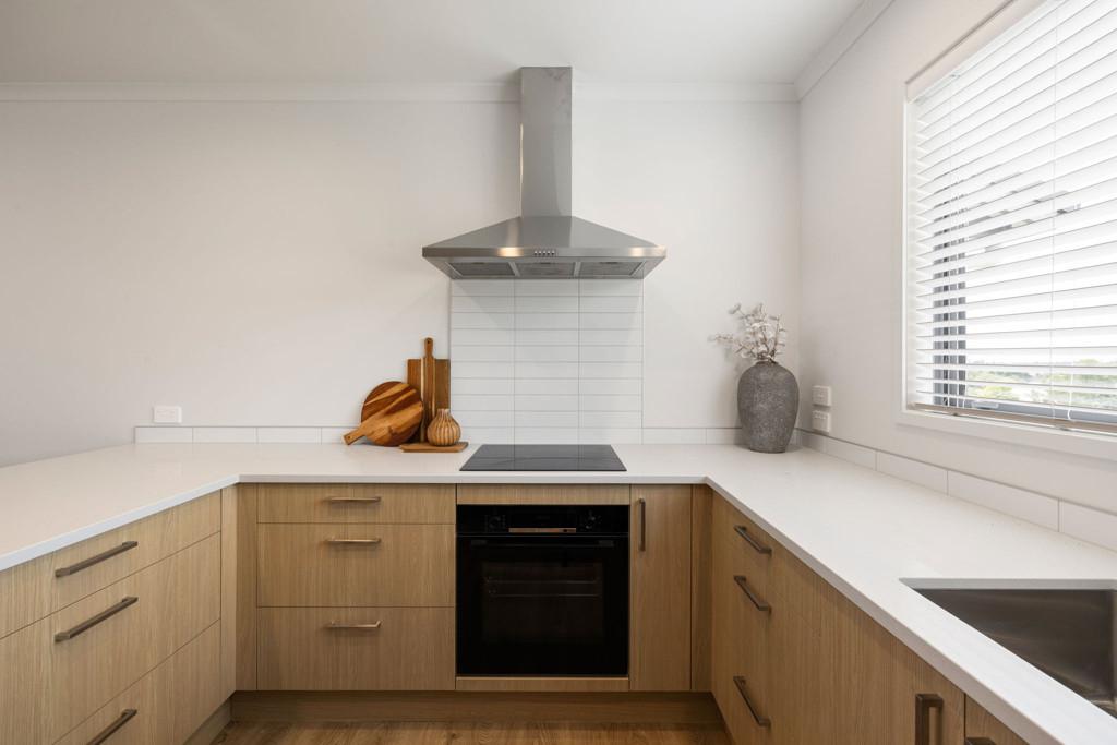 Upstairs, the light-filled second level is the heart of the home, showcasing an open-plan kitchen, dining, and living area that connects seamlessly to a deck, creating the perfect indoor-outdoor flow for entertaining or relaxing. The modern kitchen has been fitted with quality appliances including a Bosch wall oven, Fisher & Paykel single dish drawer, a tiled splashback, and sleek cabinetry for a polished, contemporary finish.