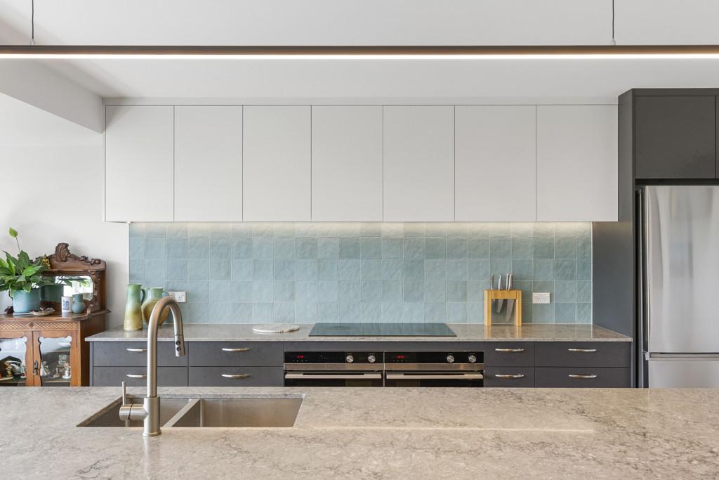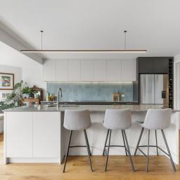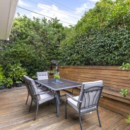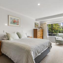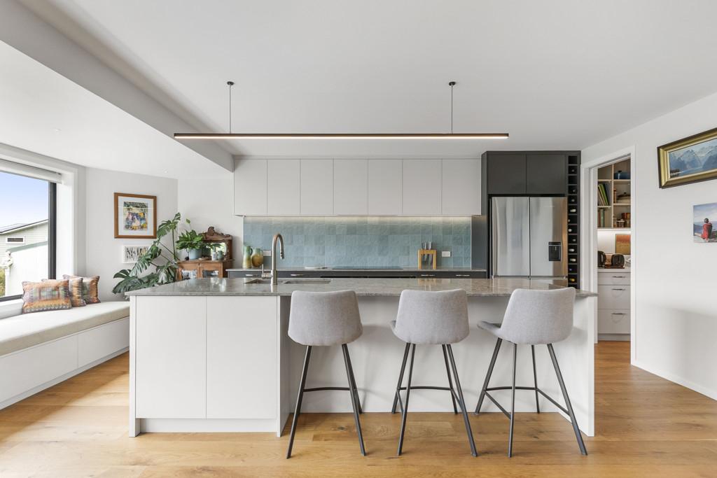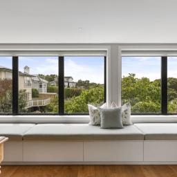 The first floor is dedicated to living and entertaining, framed by a sweeping picture window that runs the length of the space. This striking architectural feature draws in natural light and harbour views, with bespoke window seating creating an inviting anchor point for both quiet moments and gatherings. The modern kitchen is a standout, enjoying a substantial island bench and complemented by striking Caesarstone benchtop, inbuilt seating, generous butler's pantry, two ovens and an induction hob. Easily accessed from the kitchen and living spaces is a low maintenance, sheltered courtyard with afternoon sun, ideal for summer barbecues and relaxed outdoor dining. Double glazing on this level and a heat pump ensure comfort throughout the year.