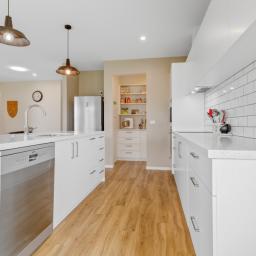 A separate lounge provides a quiet retreat, while the heart of the home is the light filled open plan kitchen, dining, and living area, a welcoming space for everyday living and entertaining. From here, along with the lounge, doors open seamlessly to a sunny patio and fully fenced backyard, beautifully planted and ideal for relaxing or hosting family and friends. The kitchen is beautifully appointed with stone benchtops and a walk-in pantry, offering both elegance and practicality.