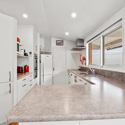 The home offers a thoughtful layout with clearly defined living areas that enhance both character and functionality. The kitchen is well positioned with excellent storage and generous bench space, featuring an opening servery window to the north-west facing, sheltered patio - creating an easy connection to the outdoor al fresco dining area, ideal for relaxed entertaining and year-round BBQs. Separate from this, the expansive lounge with soaring ceilings is framed by glazing that captures expansive views across the landscape and out to the surrounding mountain ranges, opening via large sliders to the deck and strengthening the connection to the outdoors.