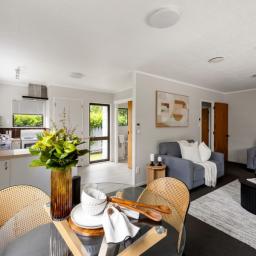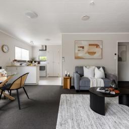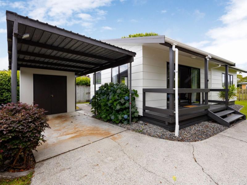 The home is presented in great condition and offers two genuine double bedrooms. At the heart of the home is the open-plan kitchen, dining and living area, a comfortable and light-filled space complete with a heat pump and SmartVent system for year-round comfort. Sliding doors extend the living area out to a cozy, sunny deck overlooking the section — an inviting spot to enjoy a morning coffee or unwind at the end of the day.