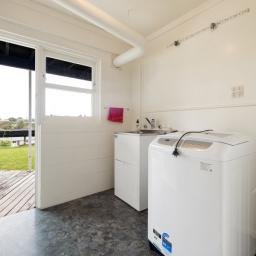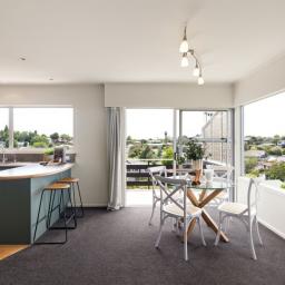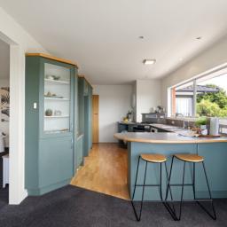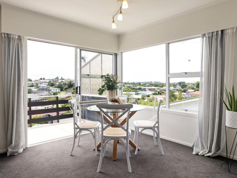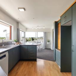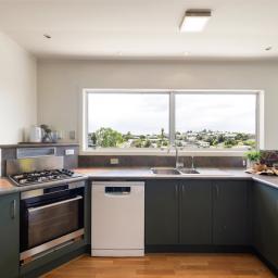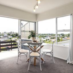 Upstairs, three well proportioned bedrooms and a family bathroom are arranged around light filled living spaces. The open plan kitchen and dining area features gas cooking and gas hot water, while a separate living room is kept comfortable year round with a heat pump. Partial double glazing adds warmth and efficiency, and the layout feels practical, welcoming, and easy to live in. Step from the dining area onto the sun soaked deck, where elevated views and morning light create the perfect place to start the day or entertain friends.