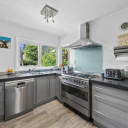 The kitchen is neat and practical, featuring modern cabinetry, quality appliances and excellent bench space, with windows framing leafy green outlooks and allowing natural light to pour in.